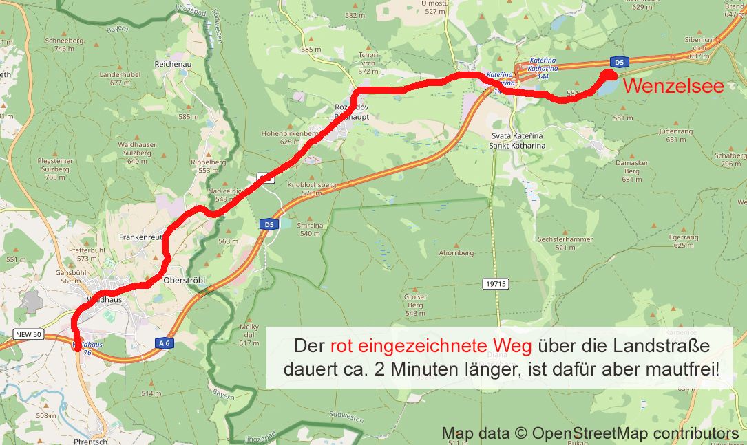 Um die Gewässer bei Branka (Grenzübergang Bärnau) zu erreichen schickt euch, wenn ihr von Süden her kommt, das Navi wahrscheinlich über den Grenzübergang Waidhaus, der Autobahn A6/D5 folgend (in rot eingezeichnet). Hierbei werden Mautgebühren fällig.