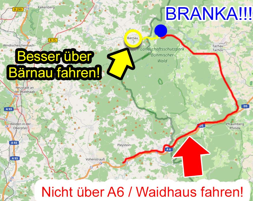 Schlauer ist es, wenn ihr auf der Deutschen Seite bis zum Grenzübergang Bärnau fahrt und von dort aus weiter nach Branka (in gelb eingezeichnet). So vermeidet ihr die Autobahn und somit auch die Mautgebühren.